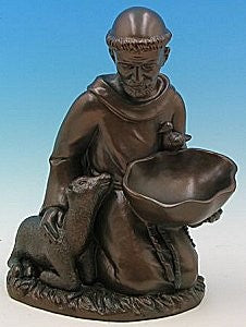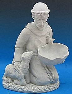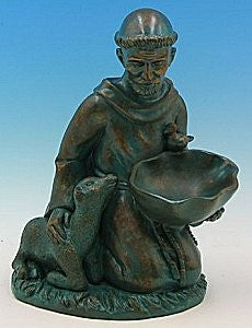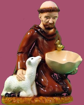 16 inch St. Francis Birdfeeder Made of durable plastic, ENJOY our Kneeling St. Francis finely detailed Bird Feeder in your favorite garden spot. Made from heavy duty unbreakable polyvinyl resin, suitable to withstand the outside elements. Available in a variety of finishes, please choose from our selection below.