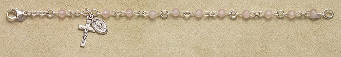 4mm Genuine Rose Quartz All Sterling Rosary Bracelet Boxed Made of 100% Sterling Silver components, 7.5" standard length. From the absolute finest collection of religious medals ever made. Thousands of original, beautiful, intricate designs hand-sculpted by master die makers in the early 1900s. Made of only the finest materials available by skilled American craftsmen using up to a 12-step manufacturing and finishing process.