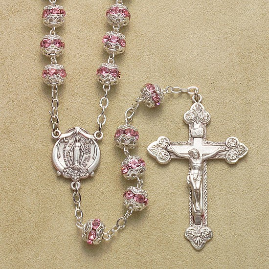 7mm Light Rose Fancy Cap Rosary with Sterling Silver Crucifix & Center - Boxed