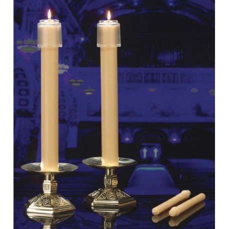 Cathedral Brand longer burning, guaranteed and stamped 51% Beeswax candles feature a dimesnsional design and are expertly crafted for table altars. Insistence on the finest beeswax is long-standing because the wax is symbolic of the purity of Christ himself.