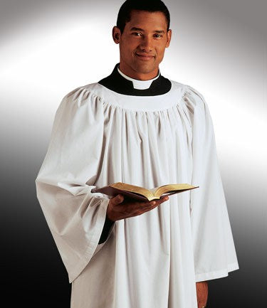 This extra-long surplice is a traditional favorite for clergy and choir alike. Ready to ship in 24 hours from factory receipt of order. Tailored in the USA in a machine washable white dacron and cotton blend. Construction features include generously cut body and sleeves and a top-stitched round yoke. *See Detailed Images for Sizing Chart
