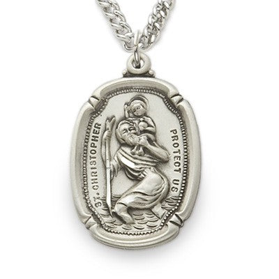 Oval-shaped St. Christopher Sterling Silver Medal Patron Protector on a 24" chain. Patron of Travelers, Sailors, against storms and sudden death. Approx. size 7/8". Special Order, Please allow 7-14 Days for Delivery.