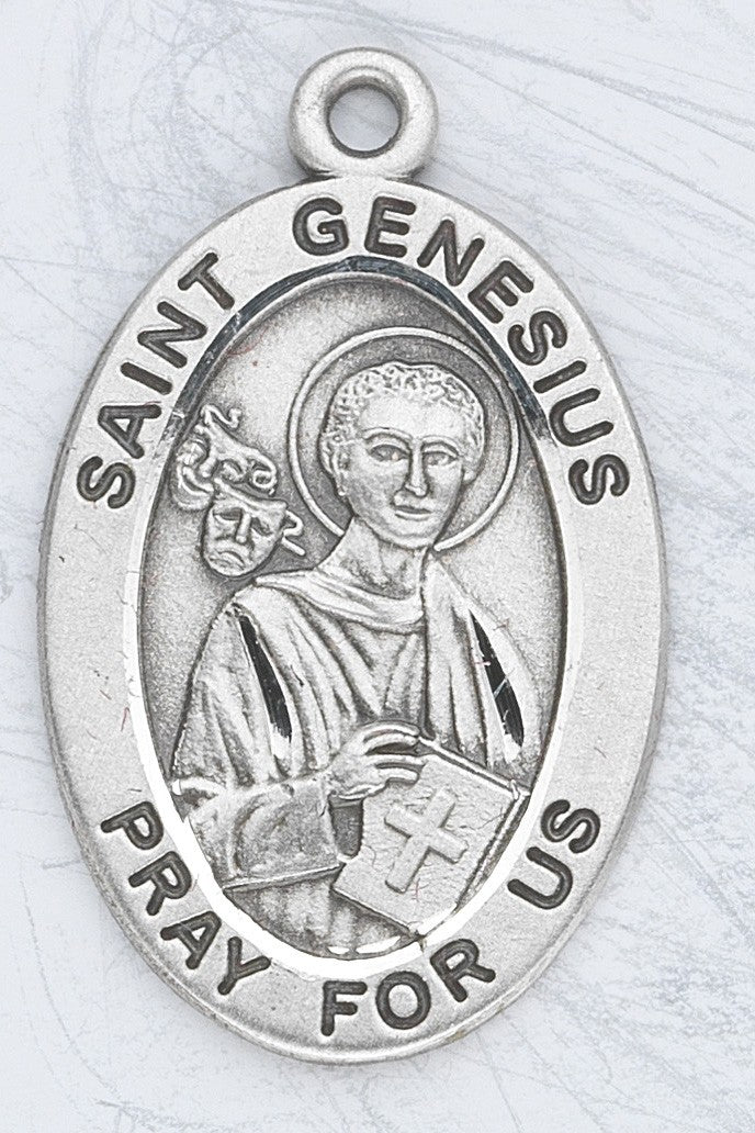 Sterling Oval St Genesius 20" From the absolute finest collection of religious medals ever made. Thousands of original, beautiful, intricate designs hand-sculpted by master die makers in the early 1900s. Made of only the finest materials available by skilled American craftsmen using up to a 12-step manufacturing and finishing process.