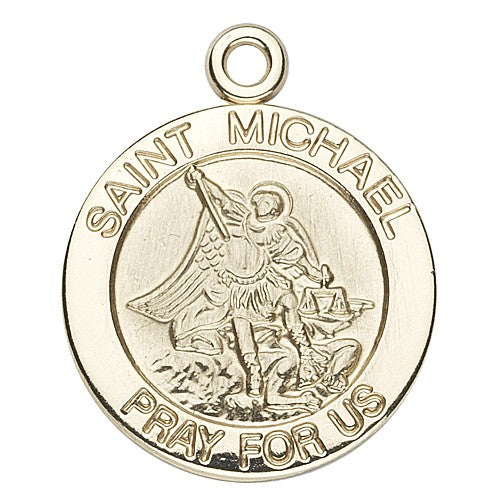 14K Small Round St Michael w/14K Jump Ring Boxed From the absolute finest collection of religious medals ever made. Thousands of original, beautiful, intricate designs hand-sculpted by master die makers in the early 1900s. Made of only the finest materials available by skilled American craftsmen using up to a 12-step manufacturing and finishing process.