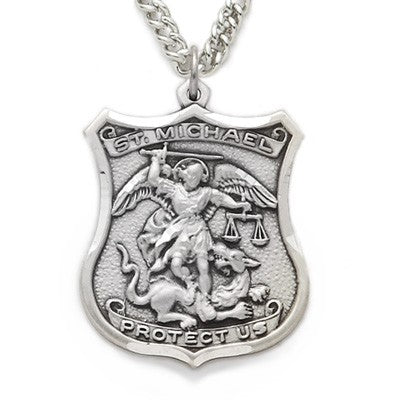 Shield-shaped St. Michael Sterling Silver Necklace Patron Medal on a 24" chain. Patron of Police, Military, EMTs. Approx. size 1-1/16"x1". Special Order, Please allow 7-14 Days for Delivery.