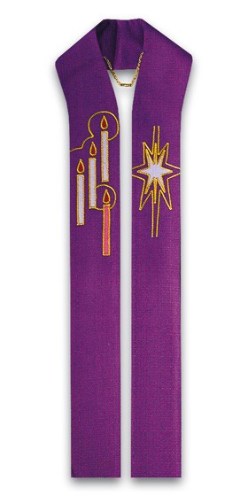 •Overlay stole• Purple for Advent, in a combination of appliqué and embroidery in gold and coloured threads. Style 75*: with stand-up collar. This stole is special made and shipped directly from Belgium, please allow 4-6 weeks for delivery. Fabric Omega Colour Purple Length 57 " / 145 cm Width 4 3/4 " / 12 cm Neck finish Stand-up collar (75)