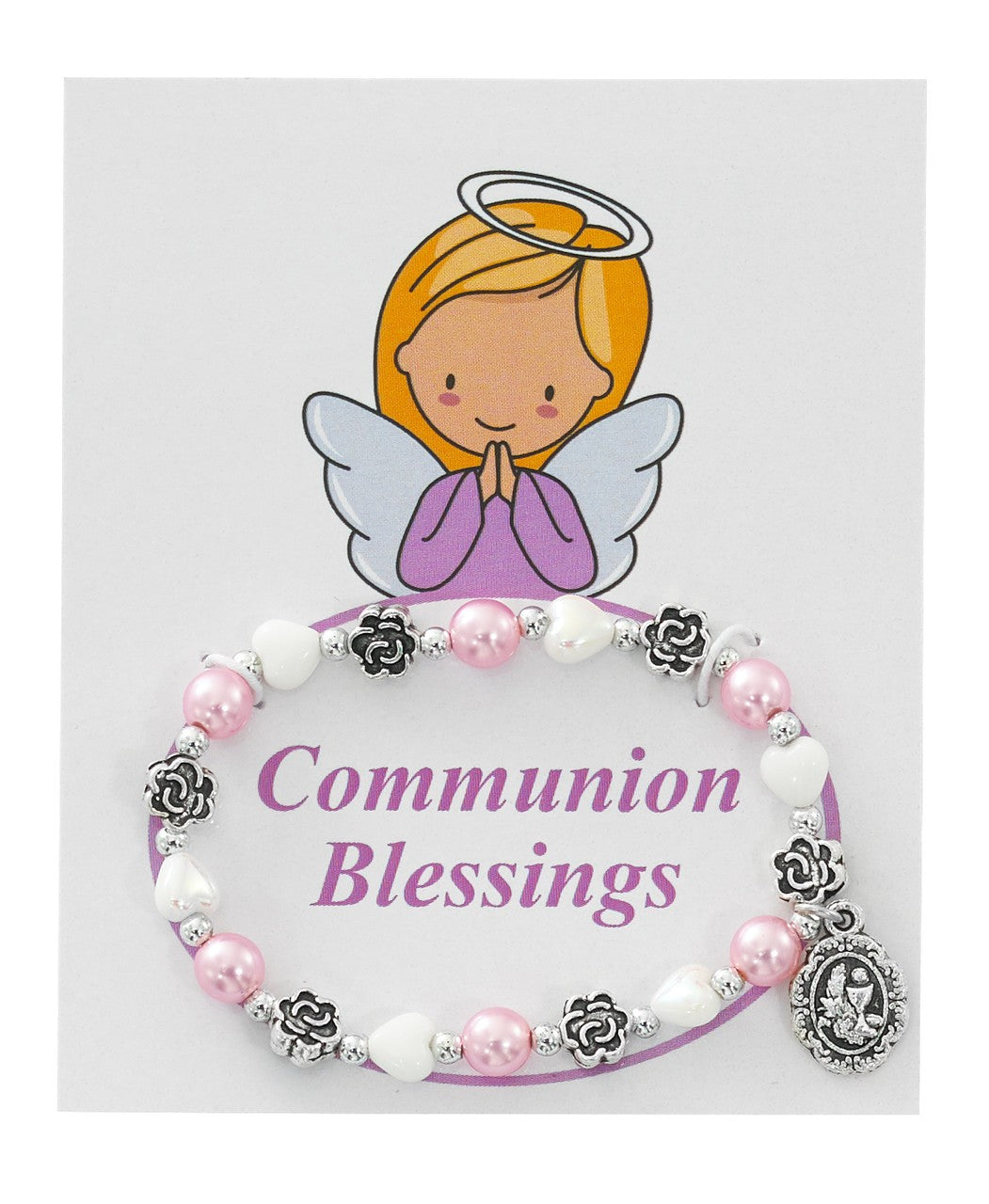 6MM WHITE HEART PEARL BEADS & PINK PEARL BEADS WITH METAL FLOWER BEADS. SILVER OX CHALICE. COMES ON PRAYING COMMUNION GIRL CARD.